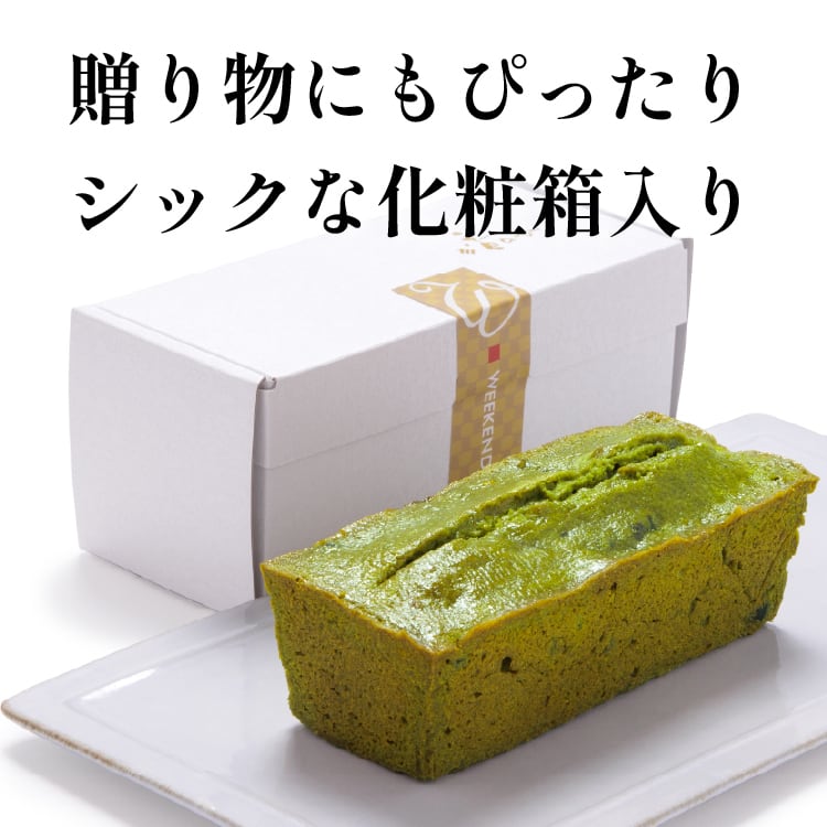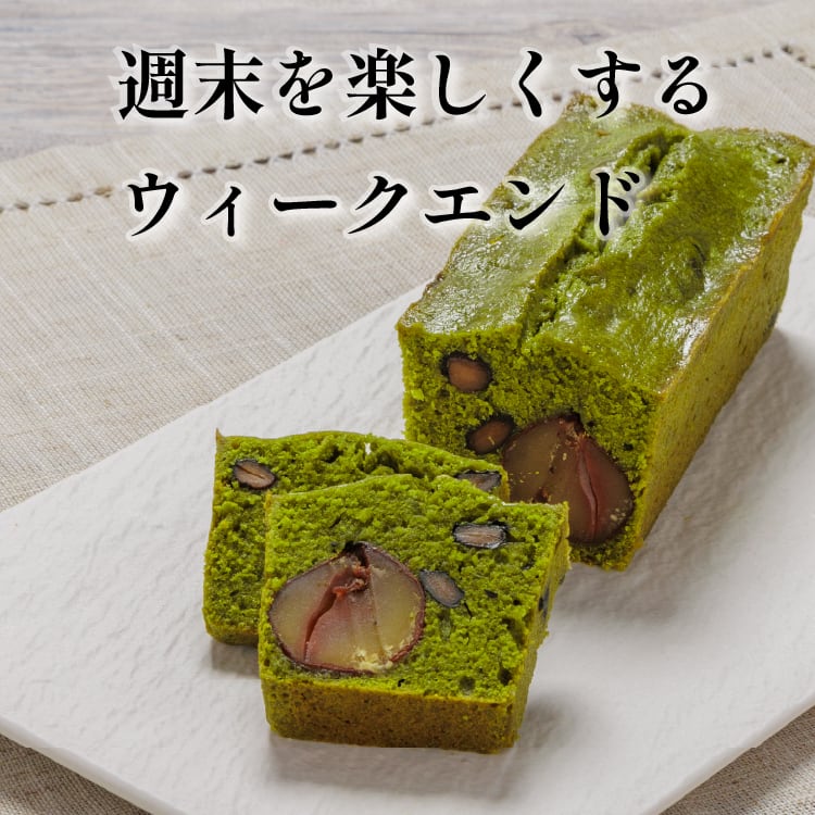 週末を楽しむ フランスの焼き菓子。ティータイムみんなで切り分けてお楽しみください。宇治抹茶を練りこんだケーキに丸ごとの栗の渋皮入り。黒豆もアクセント